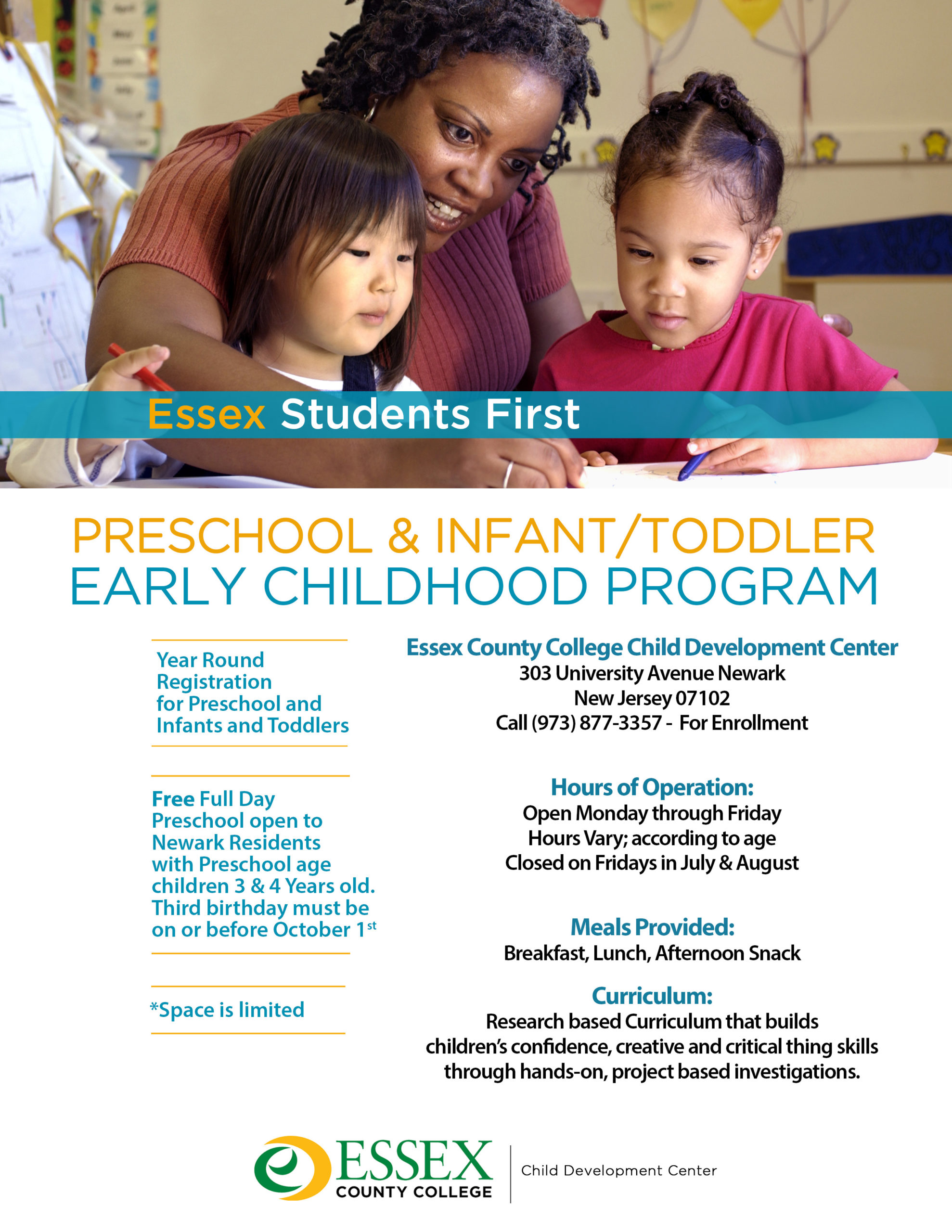 Essex County College’s Child Development Center offers a full day care and education program for children. Breakfast, lunch and snack are prepared on-site each day and served family-style to all children at no additional cost.